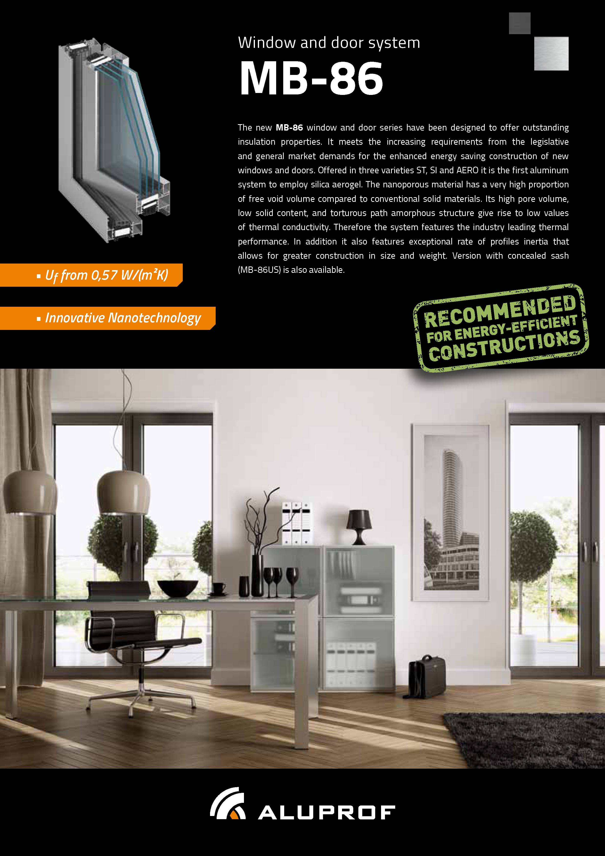 The new MB-86 window and door series have been designed to offer outstanding insulation properties. It meets the increasing requirements from the legislative and general market demands for the enhanced energy saving construction of new windows and doors. Offered in three varieties ST, SI and AERO it is the first aluminum system to employ silica aerogel, the nanoporous material that has a very high proportion of free void volume compared to conventional solid materials. Its high pore volume, low solid content, and torturous path amorphous structure give rise to low values of thermal conductivity. Therefore the system features the industry leading thermal performance. In addition it also features exceptional rate of profiles inertia that allows for greater windows in size and weight.