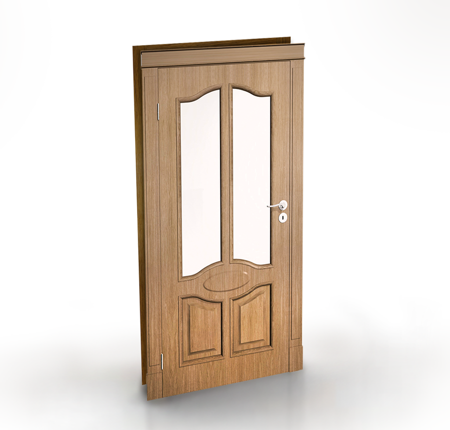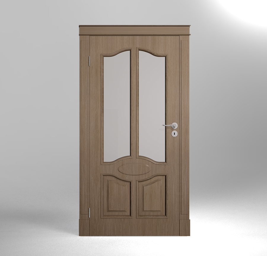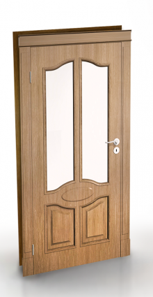 - partie supérieure du vantail : verre satiné, ornemental ou lacomat décoré par des baguettes