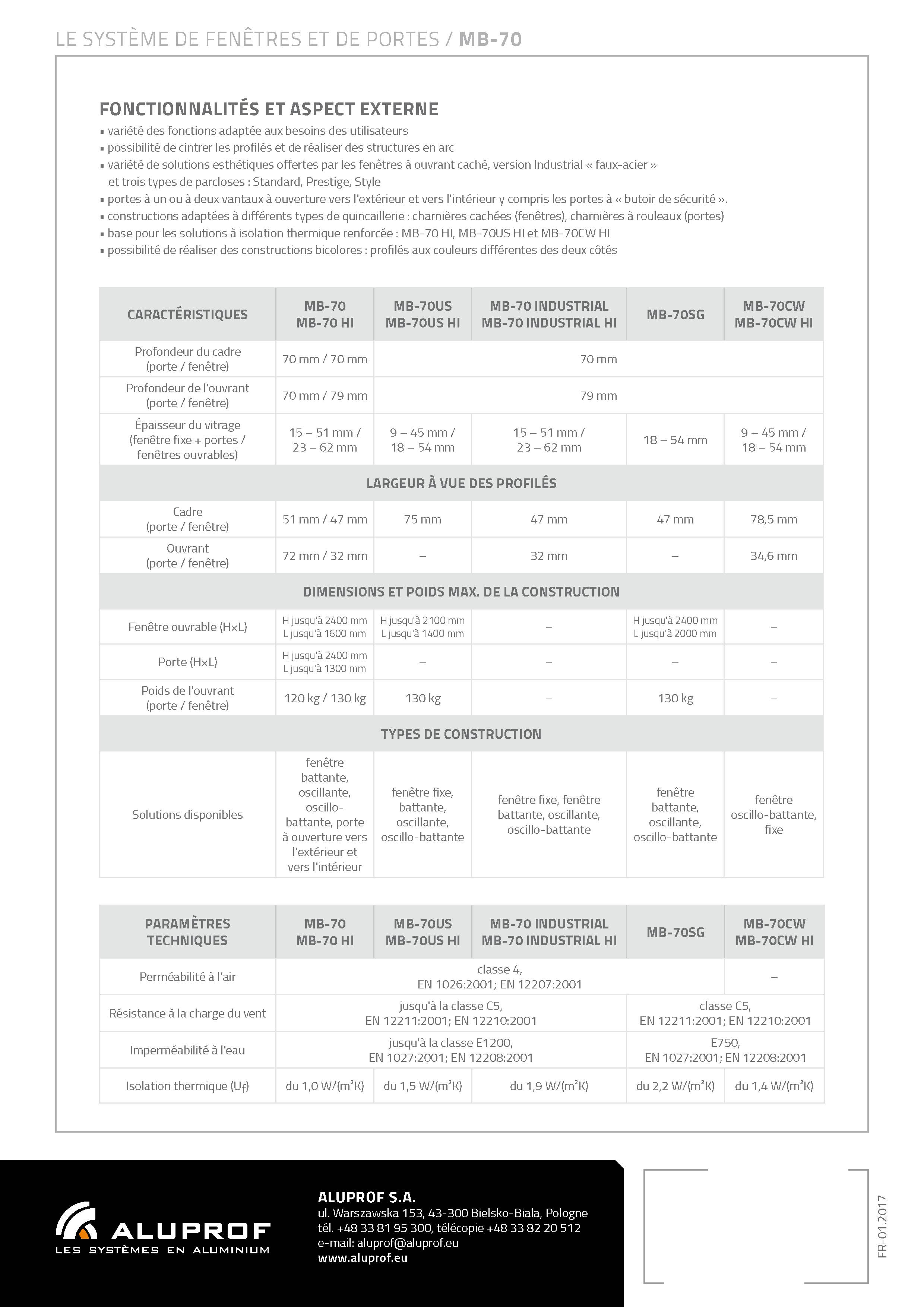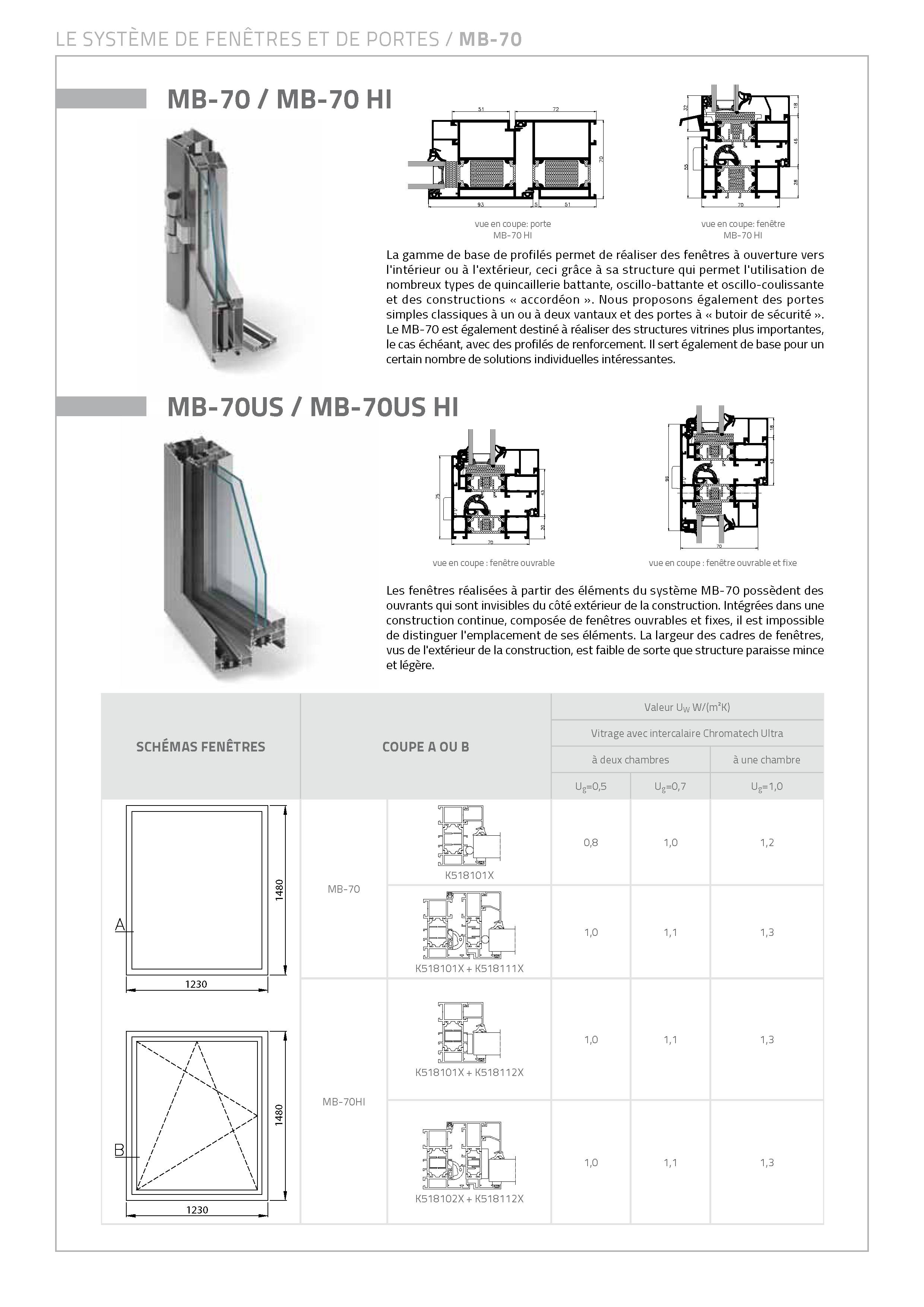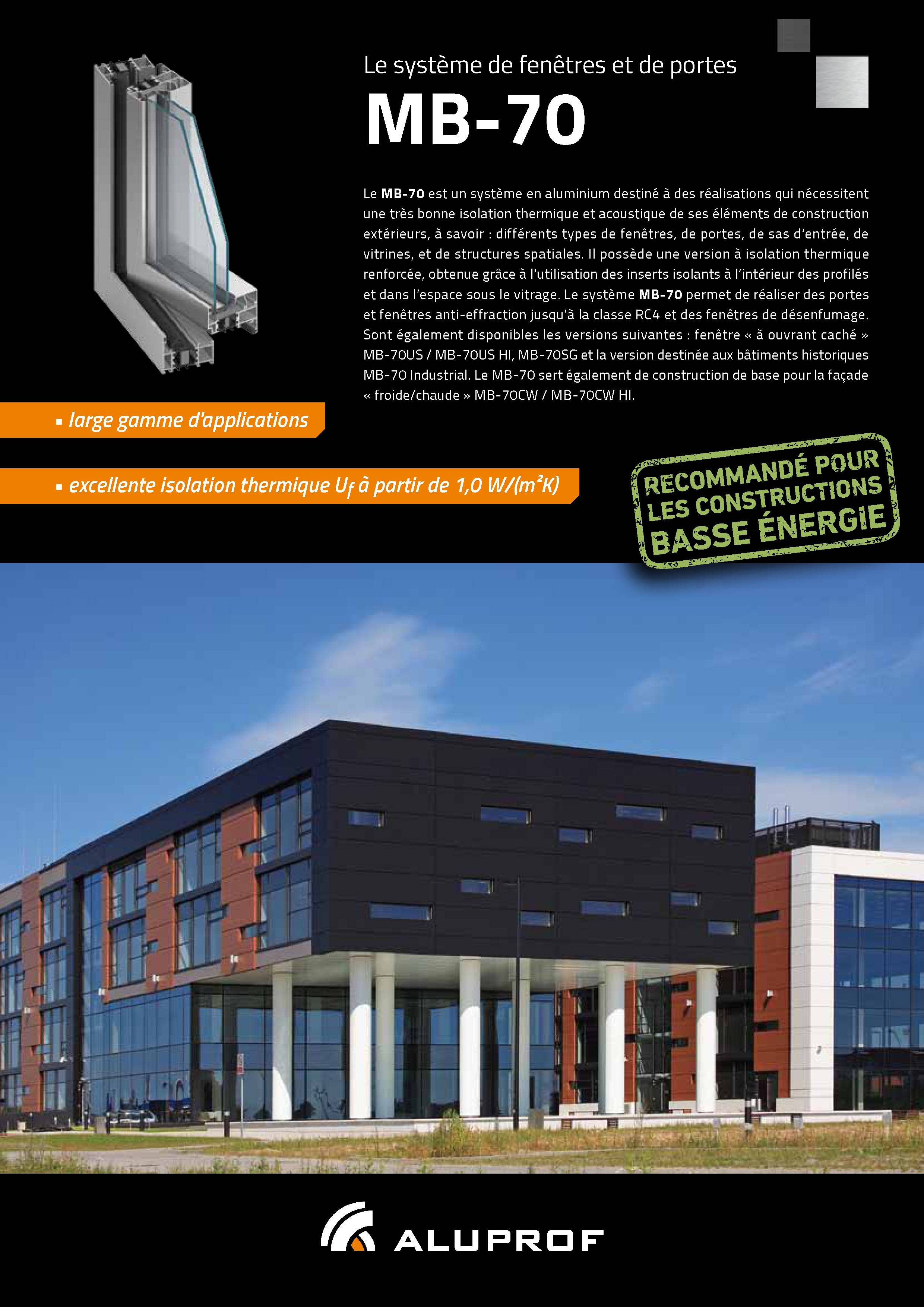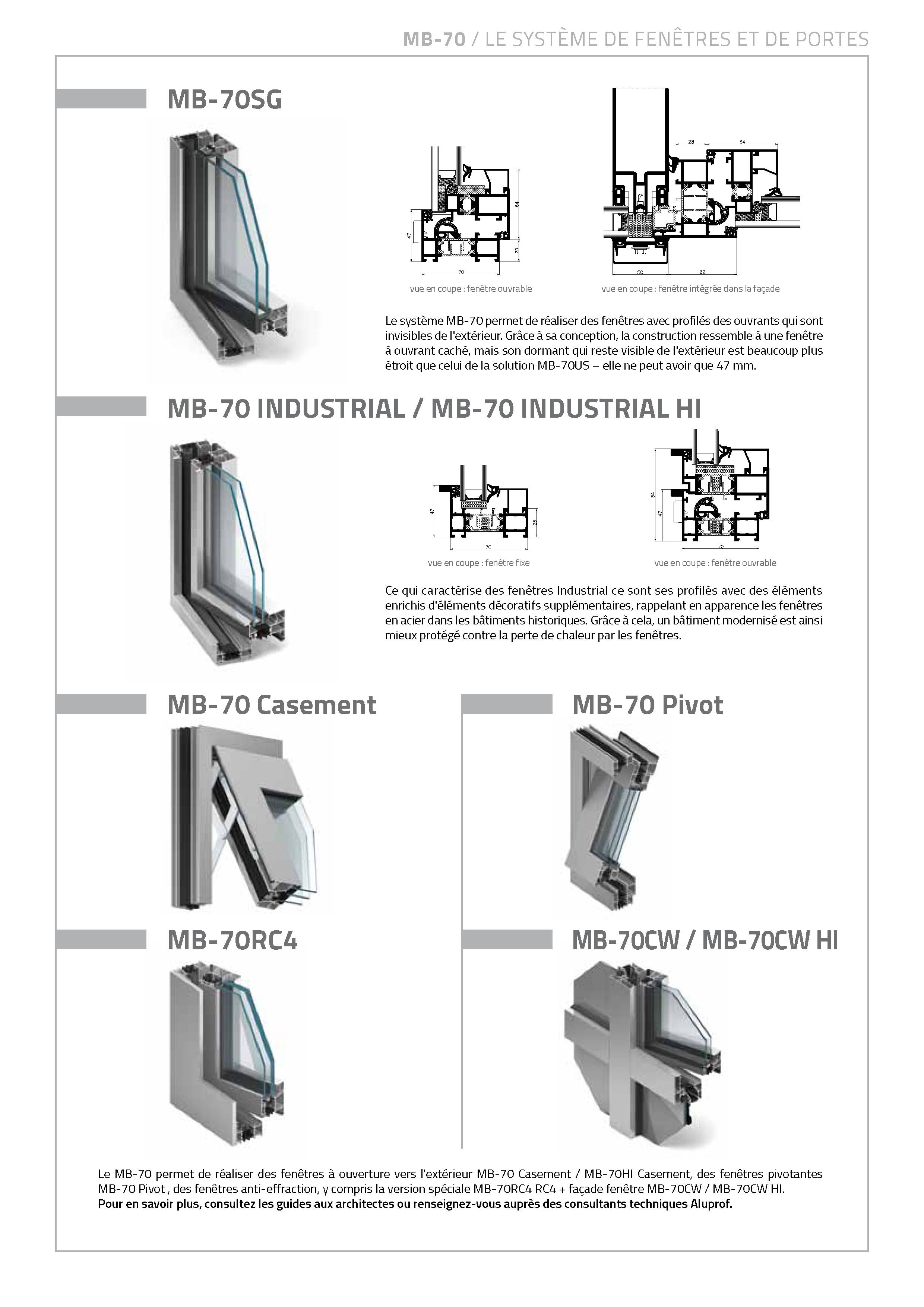 Ce système se compose de profilés à trois chambres. Les profilés des fenêtres ont une épaisseur de 70 mm (dormant) et 79 mm (battant), et ceux des portes, respectivement de 70 mm et 70 mm. Ces épaisseurs de profilés de dormants et battants donnent dans le cas des fenêtres fermées l'impression d'un plan unique vu de l'extérieur, et dans le cas des portes, un plan unique des deux côtés. La forme des profilés permet de réaliser des structures à portes et fenêtres à la fois fines et très rigides. Le système MB-70 permet aussi de réaliser des fenêtres "à battant caché" MB-70US ainsi que le modèle MB-70 Industrial, qui a été spécialement conçu pour faciliter la restauration de bâtiments classés de l'ère industrielle.